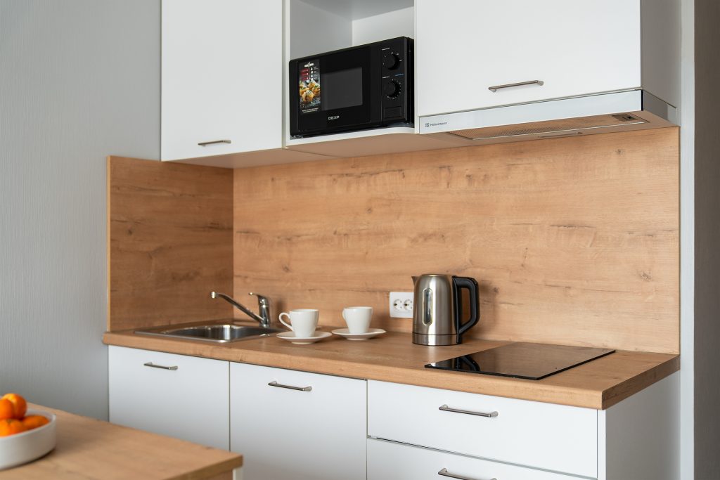 Комплектация апартамента: фен, варочная поверхность, вытяжка, холодильник, микроволновая печь, чайник, посуда и столовые приборы.