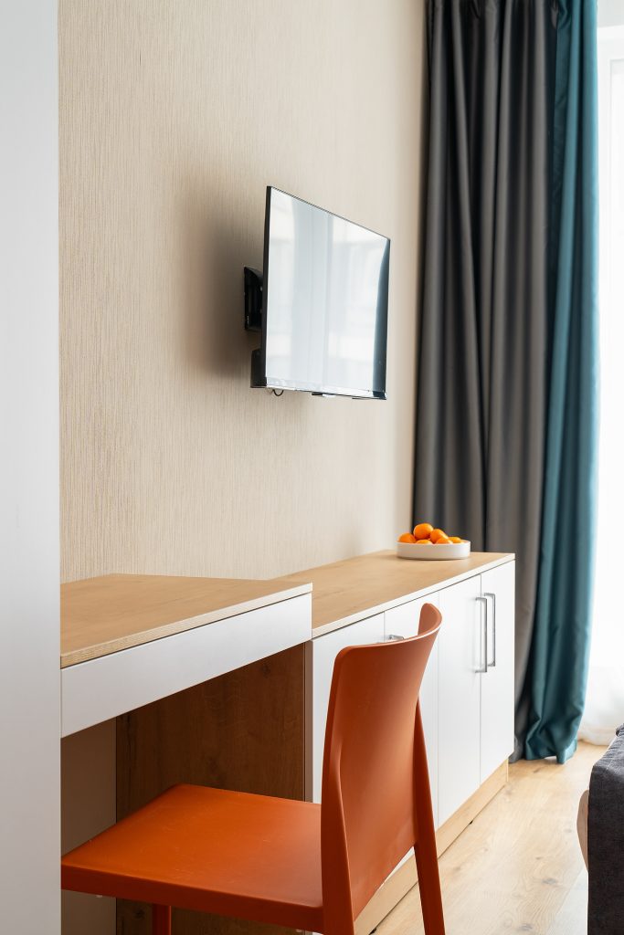 В жилой зоне размещается рабочее место, телевизор с функцией Smart TV. Кровати с профессиональными матрасами.